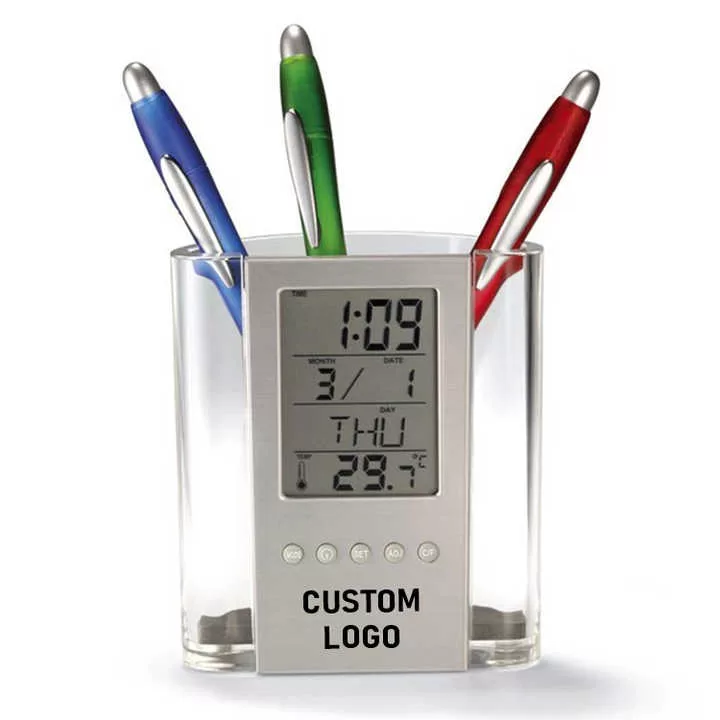 Un cadou util, compact și versatil, potrivit pentru orice birou. Acest organizator de birou include suport pentru instrumente de scris, ceas digital cu alarmă și calendar perpetual. Se personalizează pe partea frontală și poate fi inclus în pachete de tip office welcome kit. Ideal pentru evenimente corporate, HR sau marketing intern.